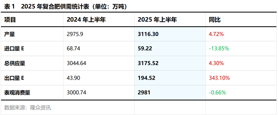 伴随新增产能投产,2025年上半年复合肥产量增加,虽进口量同比稍有下滑,但整体供应量高于去年同期。但2025年上半年出口量增量明显,总体看表观消费量低于2024年上半年。